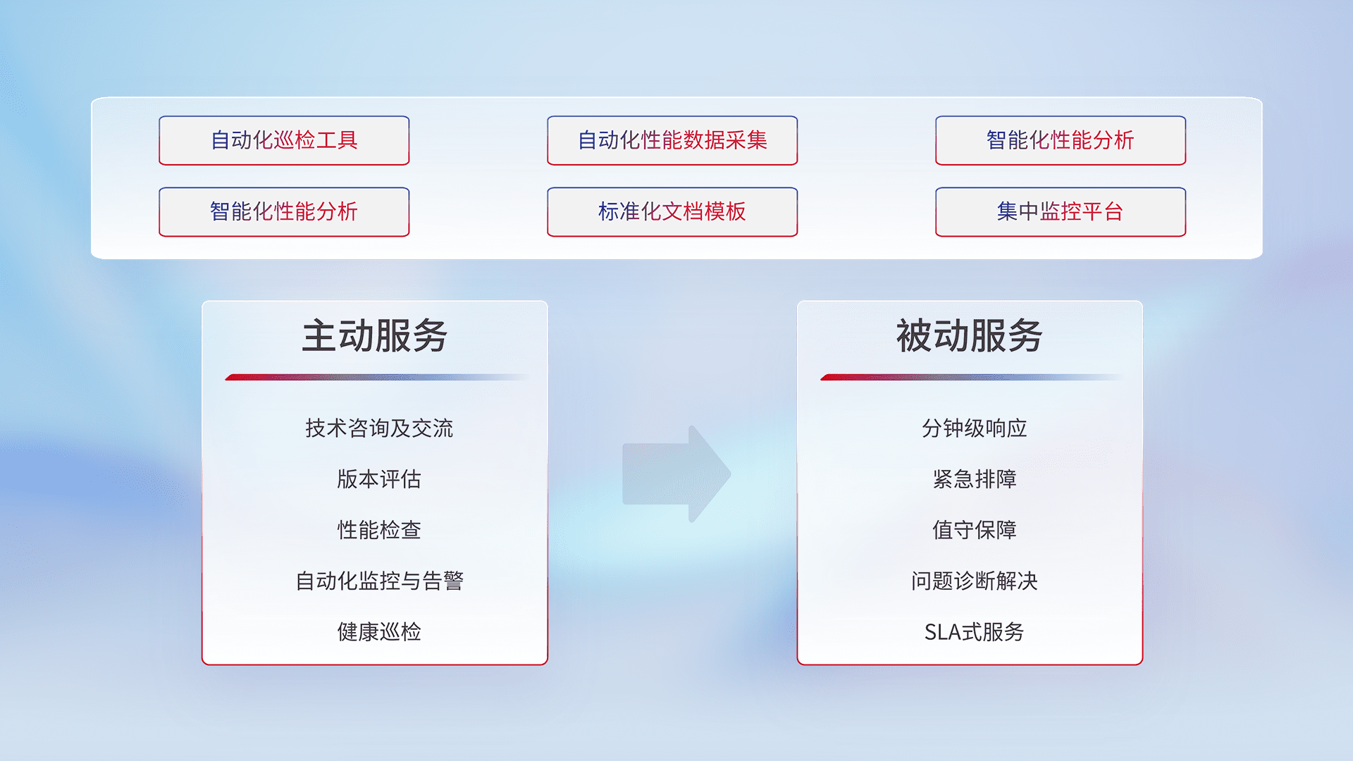 智能化工具和标准化文档,,,,保障服务质量,,,,提供主动服务(包含技术咨询、、版本评估、、、、性能检查、、、自动化监控与告警、、健康巡检)和被动服务包含(分钟级响应、、、紧急排障、、、、值守保障、、问题诊断解决、、SLA服务)。。。。